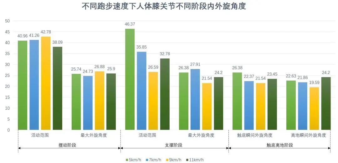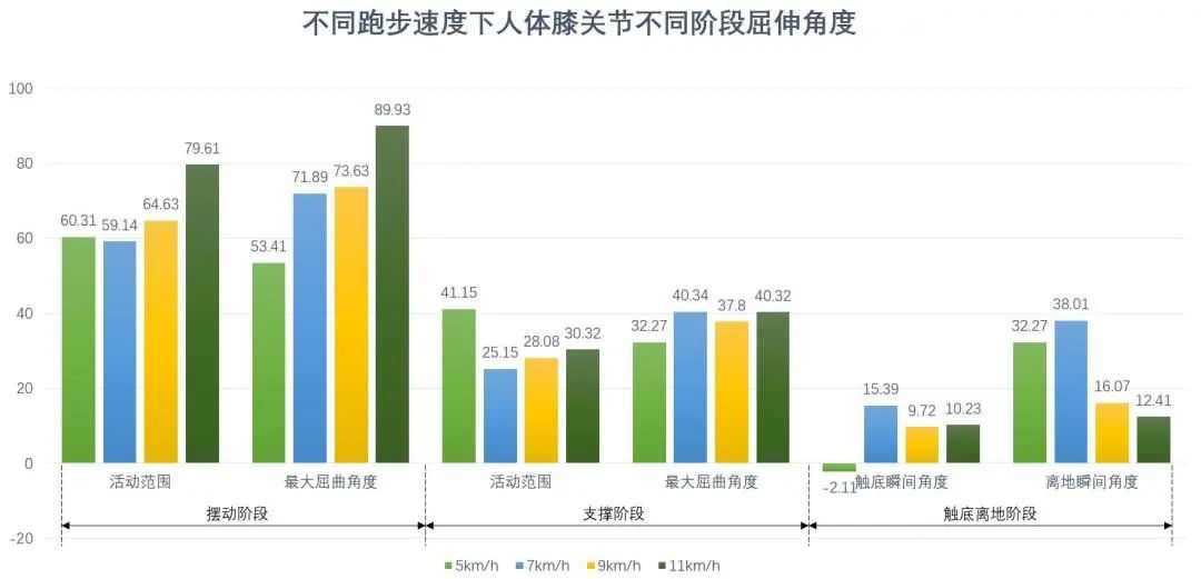 Buckling Angle: The knee flexion angle at the moment of 9km/h and 11km/h off the ground is significantly less than 5km/h and 7km/h. In high-speed running, first of all, high-speed running requires faster leg movements. Reducing the flexion angle of the knee joint can reduce the amplitude of the leg swing, reduce the time for the leg to swing in the air, improve the cadence, and increase the running speed.