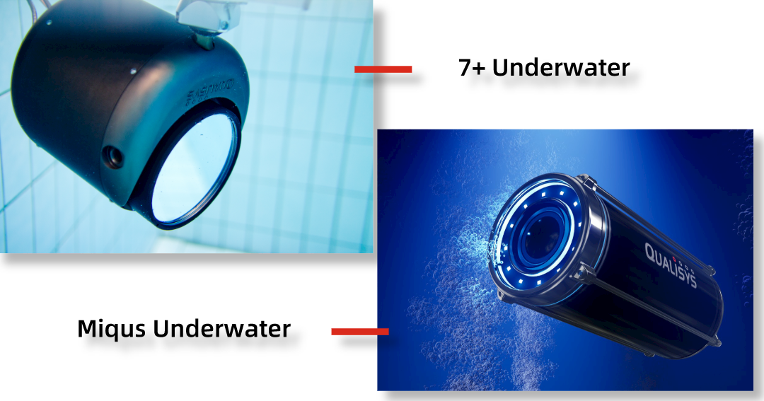 The 7 + Underwater Camera is a rugged, high-resolution camera for long-distance measurements; the Miqus Underwater Camera is compact, lightweight, and has a wide range of viewing angles, making it ideal for short and medium-range motion capture in small pools and sinks.