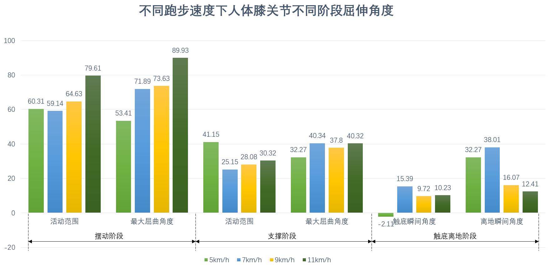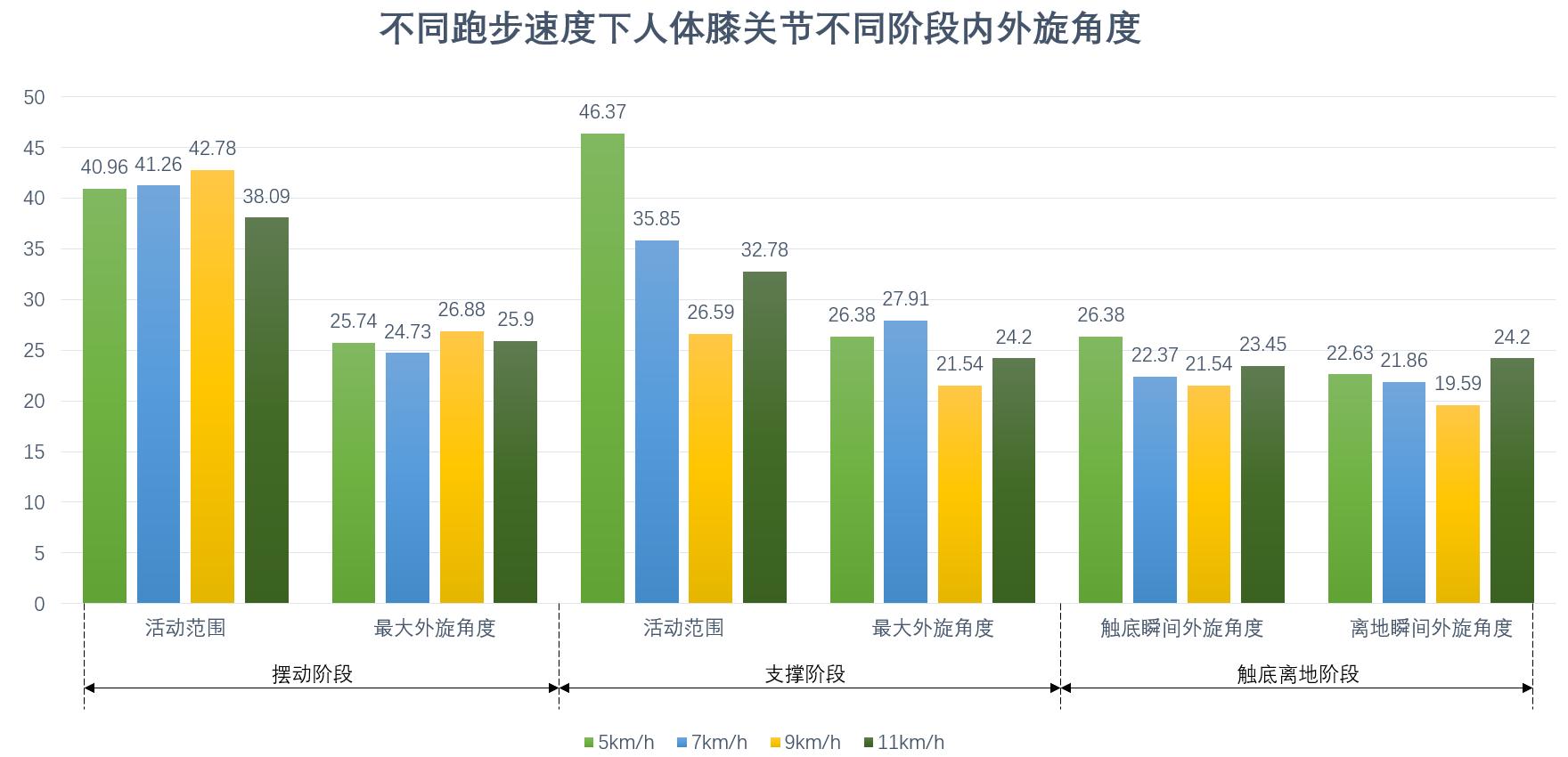 屈伸活动范围:当跑步机速度由5km/h增加到7km/h、9km/h、11km/h时,为了维持稳定性,膝关节会相对固定,减小屈伸活动范围,降低跌倒或受伤风险。