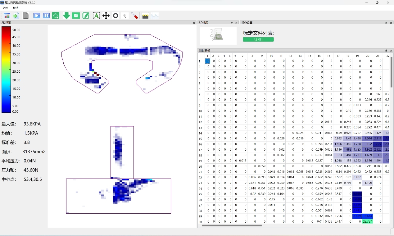 测试数据表明,测试面积为31375mm²,压力和为45.60N,平均压强值为1.5KPA,平均压力为0.04N,**压强值为93.6KPA。
