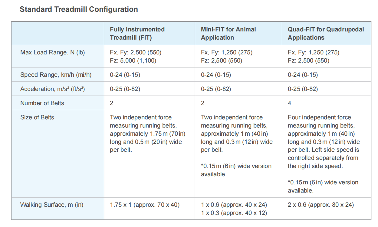 Design Unique design features result in superior dynamic  characteristics of the treadmill. The dual belt treadmill  has two belts which can be controlled independently,  each half having its own 6-modular incline feature that  can be added to the system for uphill and downhill  analysis of movements. The control electronics  incorporate medically isolated transformers.  A smaller version of FIT is available for animal studies (Mini-FIT). The Mini-FIT can be configured to have  four belts which independently measure forces for  quadrupedal animal studies (Quad-FIT). Bertec treadmills are mounted on mounting plates, which  are glued to the floor. Such a configuration along with  total isolation of each half from the other ensures stable  operation of the treadmill.