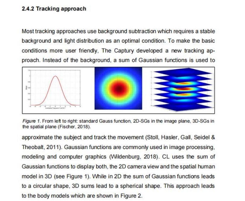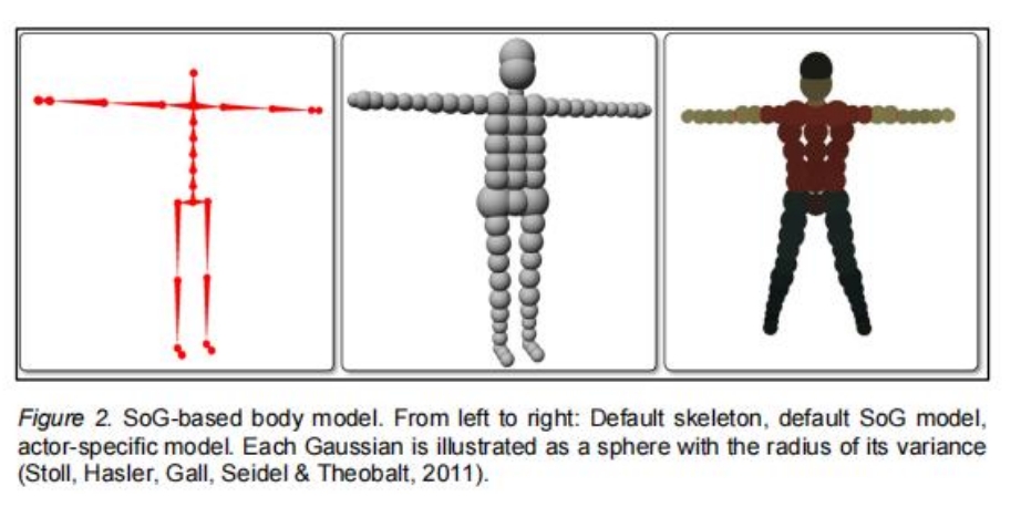 大多数跟踪方法采用背景减影,需要稳定的背景和光分布作为*优条件。为了使基本条件更 方便使用,Captury 开发了一种新的跟踪方法。代替背景减影法,captury 利用高斯函数集 来估算物体并且追踪它的运动。高斯函数常用于图像处理、建模和计算机图形学 (Wildenburg,2018)。Capturylive 使用高斯函数集来显示二维摄像机视图和三维空间人 体模型(见图 1)。在二维中,高斯函数集变成圆形,而三维的和变成球形。这种方法导致 了如图 2 所示的身体模型。