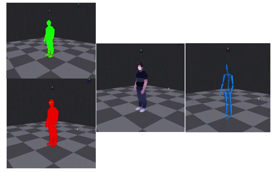 受试者模型校准 为了获取和扩展一个新人,采用了两个阶段的过程。首先,在所有视频观看中,骨架都覆盖 在人身上,并缩放以匹配他们的身体尺寸。这可以通过自动搜索功能完成,或者操作员可以 将骨架拖放到跟踪区域中可见的任何人的顶部。在第二阶段,该人需要四处走动并进行各种 动作,例如弯曲膝盖或手臂。这有助于更准确地确定骨骼长度和关节中心。整个过程只需几 秒钟。