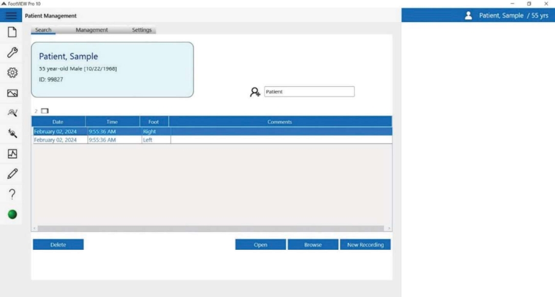 FootVIEW针对患者管理功能提供了一个数据库,用于组织和储存压力记录档案,并自动将压力记录储存到与每个患者记录相关联的活页夹中,收集到的每个患者记录可以通过患者的数据库访问并打开进行分析。