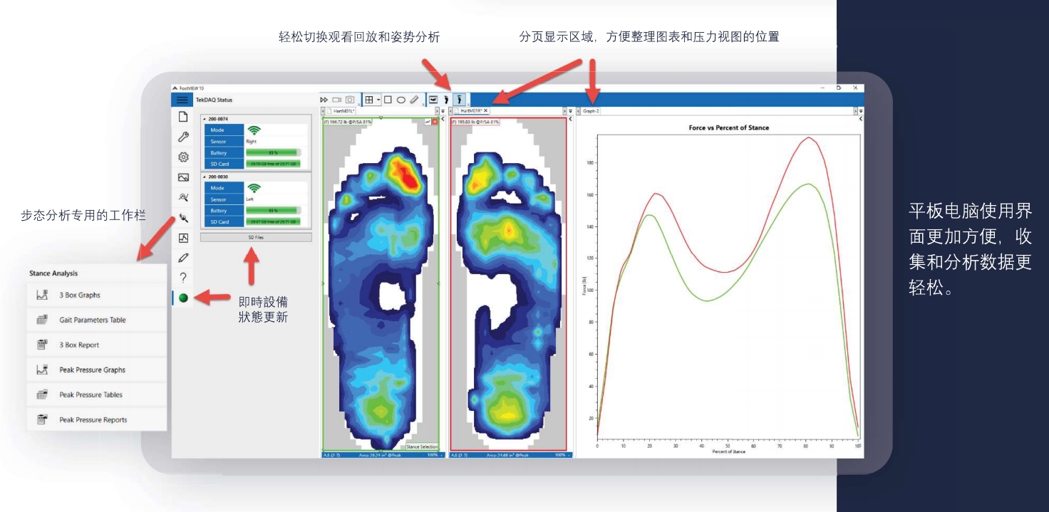 FootVIEW Pro 包含 FootVIEW 的所有功能,并额外增加了针对生物力学实验室中动态活动和研究所设计的功能。