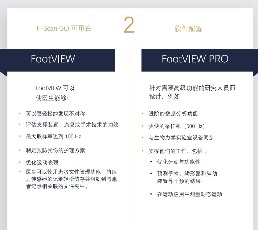 F-Scan GO 是 F-Scan 鞋内压力测量系统的下一代。F-Scan 鞋内系统提供了关于足部功能和步态分析的动态压力、力量和时序信息。