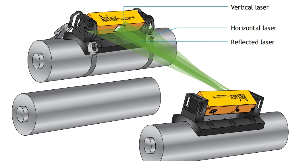 Parallel Roll Alignment, utilizing the RollCheck® Laser Roll Alignment System to measure and correct vertical and horizontal angle between 2 rolls. RollCheck® is a laser roll alignment system that facilitates accurate visual alignment of process rolls during replacement operations. The Laser Transmitter is mounted to a stationary roll that transmits two green laser lines to the Reflector positioned on the roll to be moved. The operator then is able to view both the vertical (pitch) and horizontal (parallel) angles and accurately adjust the roll into parallel alignment. RollCheck® is suitable for aligning rolls of most diameters that are spaced from 6” (152 mm) to 10 ft. (3 m) or more apart. It also can be used to align and measure crowned rolls as well. RollCheck® eliminates cumbersome trial and error adjustments which lead to scrap, loss of time and output reduction and is the ideal tool for efficient roll maintenance.