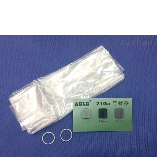 超声血管导引穿刺套件包括导针器、弹性圈、医用超声耦合剂和探头护罩4个组件,导针器和探头护罩的材质为低密度聚乙烯,弹性圈的材质聚异戊二烯,耦合剂的材质为聚合物凝胶;超声血管导引穿刺套件为环氧乙烷灭菌,一次性使用。