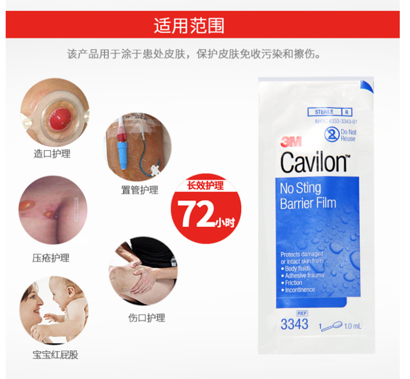 在皮肤上形成透明防水的薄膜(有效的抵御外界有害物质)无毒成分,不含酒精(无痛、不影响伤口愈合)30快干,简便易用长达72小时有效保(良好的防水、抗摩擦性、无需反复涂擦)。