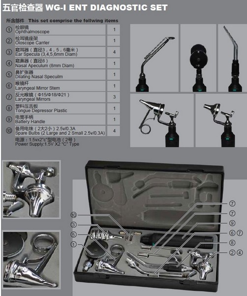 ●五官检查器供医生检查眼底、耳腔、鼻腔、口腔、咽喉部之用。