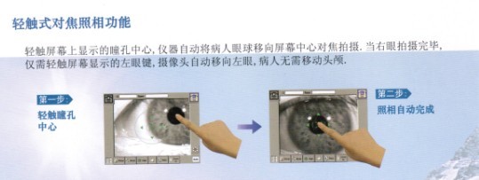1.8.4寸彩色液晶LCD触摸屏,轻触式对焦照相 采用8.4英寸大屏幕彩色液晶触摸,其屏界面友好、使用方便 。轻触液晶触摸屏屏幕上显示的瞳孔中心,仪器自动将病人眼球移向屏幕中心对焦拍摄,当右眼拍摄完毕,仅需轻触屏幕显示的左眼键,摄像头自动移向左眼;病人无需移动头颅,具有眼球跟踪功能。