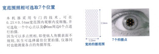 3.大范围照相并可选取7个位置进行拍摄  本机采用专利技术可在0.25*0.54mm的范围内观察内皮细胞,并可选取一个中心以及Φ6mm周边6个点进行拍摄,即使病人角膜不规则,医生也能选择最佳位置拍摄,同时也能测量各点的角膜厚度。