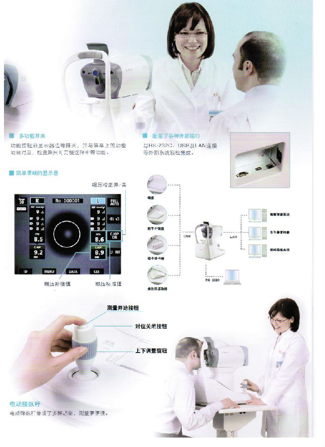 "全自动"模式操作简便,可以即刻顺利获得测量值。此外,即使医生站立查看,彩色液晶显示器也可调整至方便查看的角度,更方便操作