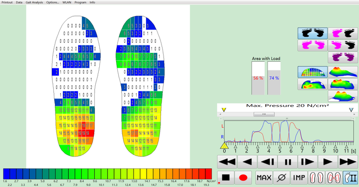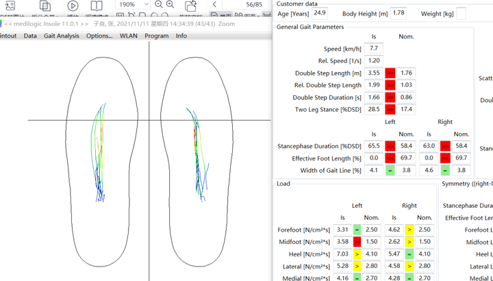 Medilogic足底压力测量鞋垫还可以自动计算出步态周期中的运动学参数,包括步长、步幅、步速、步宽等,并内置正常步态模式测试人员的数据库进行对比分析。