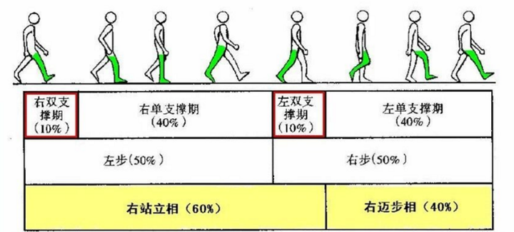 因此,当一个下肢进入支撑阶段时,另一下肢没有离开地面,两个下肢的负重同时称为两个肢体的负重期。两肢的负重期约占整个周期的28.8%,占支撑期的44.8%。支撑期的其他时间是单肢负重期。随着年龄的增长,步态周期中单支撑阶段和双支撑阶段的比例也增加。对于一侧有损伤(如假体或损伤)的患者,这一侧的站立阶段持续时间通常比另一侧更短。