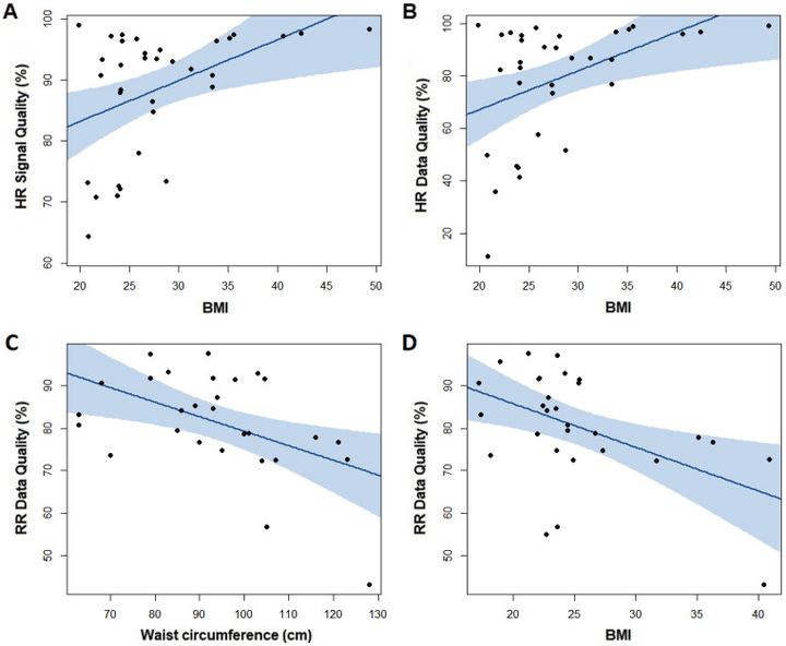 ·稳定组 (n=49) 内 (A) HR 信号质量与 BMI 和 (B) HR 数据质量与 BMI 之间的关联,以及 AECOPD 组 (n=35) 内 (C) RR 数据质量与腰围之间的关联(D) RR 数据质量和 BMI。阴影区域表示 95% CI 和P值以及使用 Spearman ρ 计算的相关性。AECOPD:慢性阻塞性肺疾病急性加重;HR:心率;RR:呼吸频率。