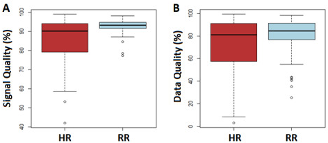 ·HR 和 RR (A) 信号质量和 (B) 数据质量。数据显示为由第 25 个百分位(框的下端)、中位数(框的中心线)和第 75 个百分位(框的上端)组成的箱线图。每个框外的线对应于最小值和最大值。HR:心率;RR:呼吸频率。