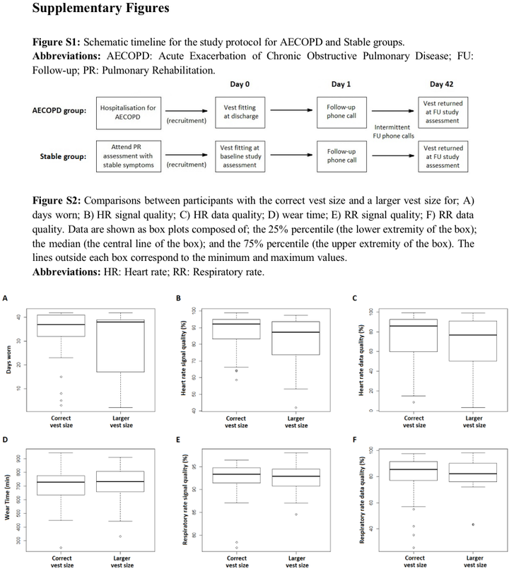 所有参与者都被要求连续 6 周在醒着的时候佩戴 Equivital EQ02+ LifeMonitor 设备(Equivital)(在此称为“背心”)。参与者被要求在水上活动期间脱下背心,并至少每隔一晚在一夜之间为传感器电子模块 (SEM) 充电。AECOPD 组被要求在出院后开始穿戴背心,将出院后的第二天作为穿戴的较前列天。稳定组被要求在他们的基线研究评估后(在初始 PR 评估后)穿上背心。基线访问后的第二天是佩戴的较前列天(图1)。