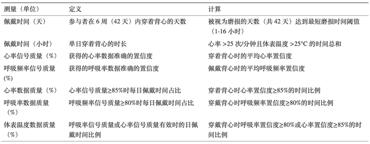 可行性指标的定义和标准(图2)。依从性由背心在 6 周研究期间穿着的天数和每天的穿着时间来定义。检查丢失的数据并将其归类为电池耗尽(无法为 SEM 充电)或非磨损。
