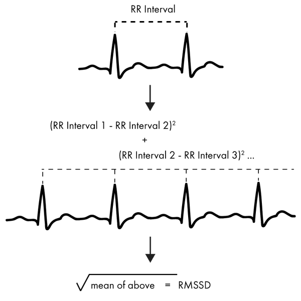 分析 HRV 的较常见方法是称为RMSSD的时域方法。这是每次心跳之间连续差异的均方根。它计算起来相对简单(对于大规模计算很重要),并且提供了 HRV 和副交感神经活动的可靠测量。如何计算它如下图所示。