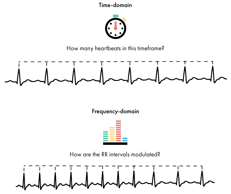HRV 计算方法的主要划分之一是使用时间或频率。在这种情况下,时域方法意味着使用一定时间内的逐搏量,而频域方法则计算发生的低频和高频搏动的数量。这在下图中进一步解释。