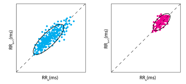 因此,Poincaré 图显示了每个 RR 间隔预测下一个 RR 间隔的程度——值的更大分布意味着 HRV 增加,而它们越靠近,HRV 就越小。庞加莱图的两个示例如下所示 -左侧显示高心率变异性,而右侧显示有限的心率变异性。