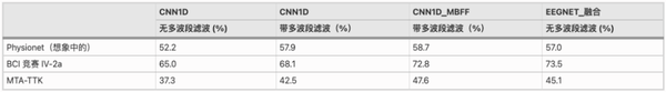 第一种是没有使用多波段滤波的地方,它被应用于 CNN1D 和 EEGNet_fusion 模型。