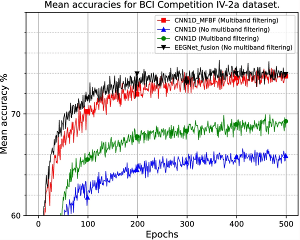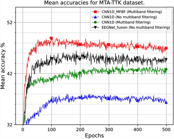 当将CNN1D_MFBF模型与EEGNet_fusion模型进行比较时,它为 BCI Competition IV-2a 数据集提供了相当的精度结果,为 Physionet 和 MTA-TTK 数据集提供了更好的精度结果。