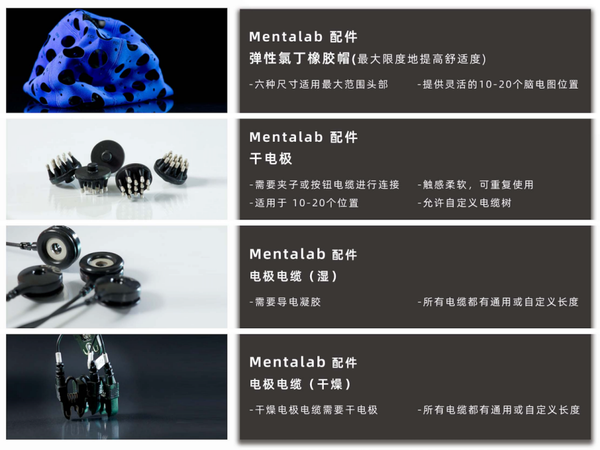 产品配件电极由弹性氯丁橡胶制作,提供灵活的10-20个EEG位置提供较大的舒适度,并且提供6种电极帽尺寸(涵盖幼儿到成人等头型范围)。