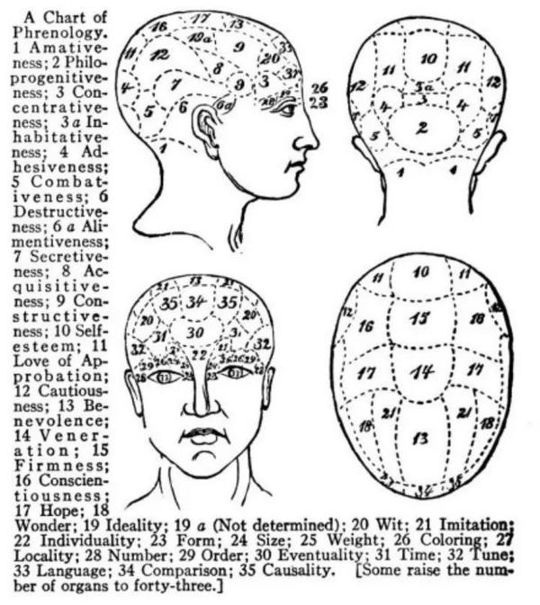 出自:19 世纪,颅相学(脑功能定位学说--法国解剖学家加尔和施普茨海姆共同创立)。