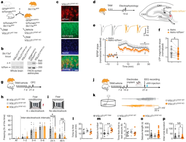 图示:星形胶质细胞中的VGLUT1缺失会导致皮质-海马回路中的LTP、记忆力和急性癫痫发作模式发生变化。