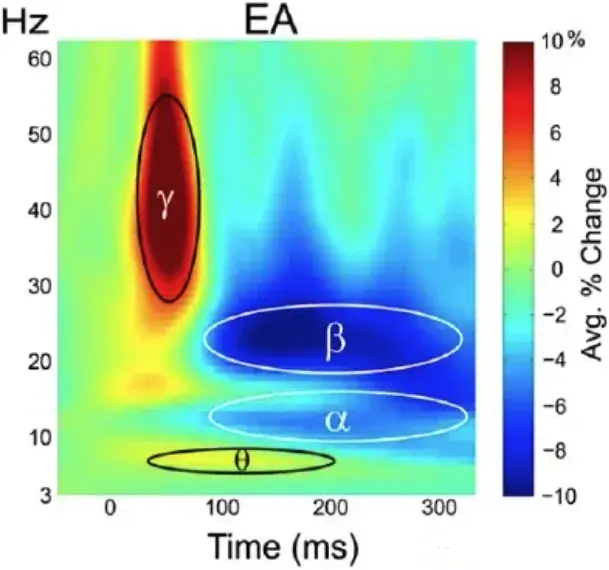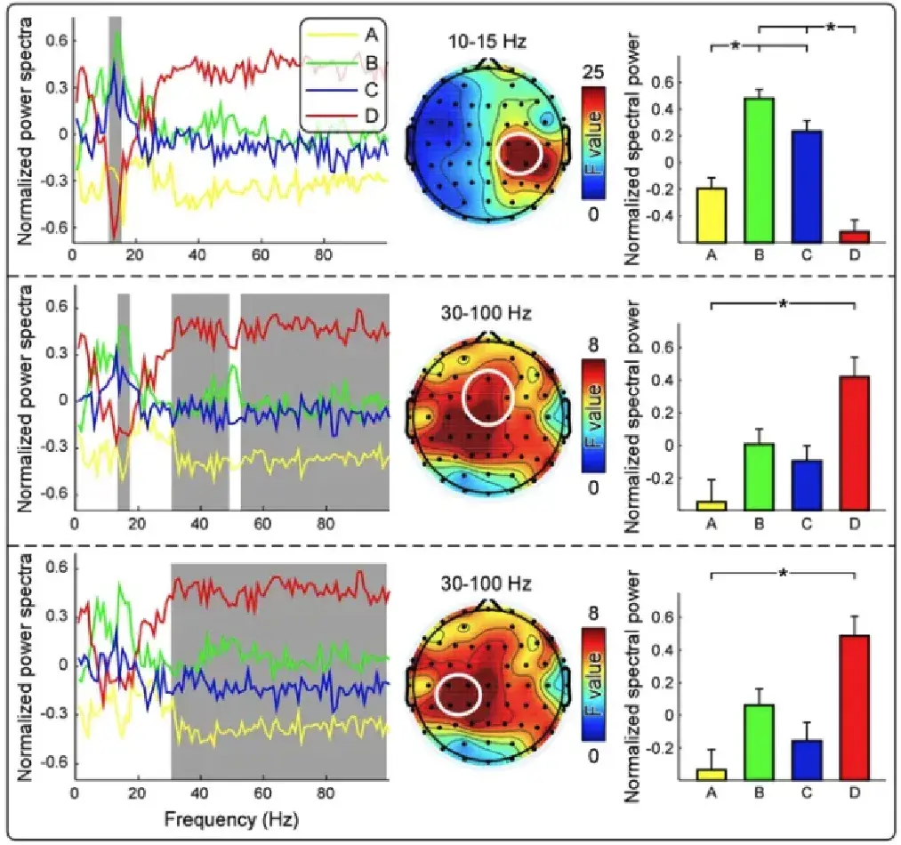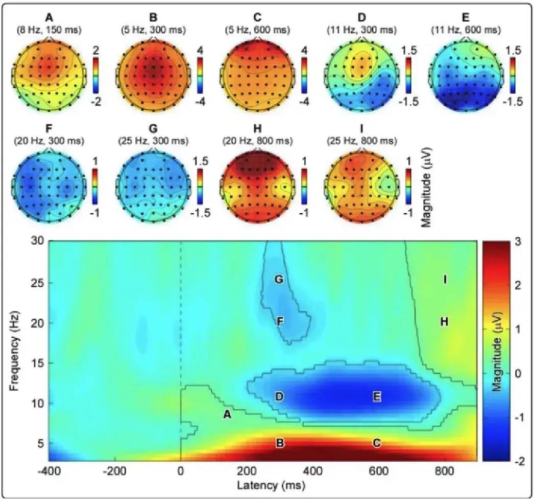 分析方法:对各被试、各通道、各分段的数据做时频变换,得到各时频点的能量,再做统计分析。