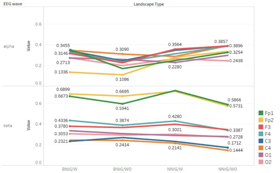 对于 beta 波,对四组(BNIG/wo、BNIG/w、NNIG/wo 和 NNIG/w)进行了单向方差分析,因为景观类型和成人存在对 beta 波的相互作用效应并不**,类似于 alpha 波结果。