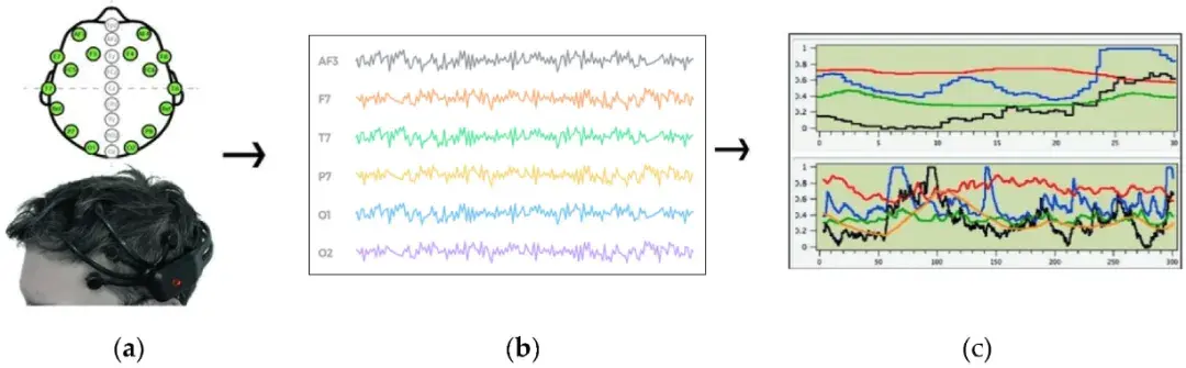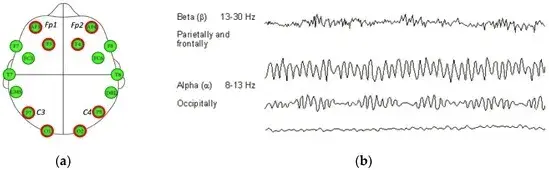 在12个EEG通道中,研究使用了额叶(Fp1、Fp2、F3、F4)、枕叶(O1、O2)和顶叶(C3、C4)的8个主要通道来捕捉两种主要波:α波和β波(见图5)。