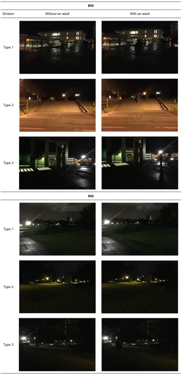 实验确定了两个夜景**环境,每个环境有三张照片:“建成”(或“灰色”)场景(即建筑物、道路、墙壁等)作为建成夜景图像,“绿色”元素(田野、森林和公园)作为以自然为主的夜景图像。