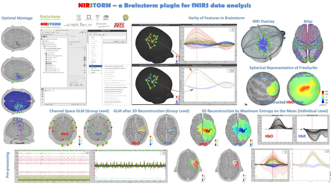 Nirstorm是Brainstorm工具包的一款**开源插件,主要用于EEG/MEG的溯源分析,但是借助如Nirstorm可以用于fNIRS数据的分析。该软件具有滤波、降噪、运动矫正、MBLL、窗口平均,使用GLM进行统计分析等多种功能。