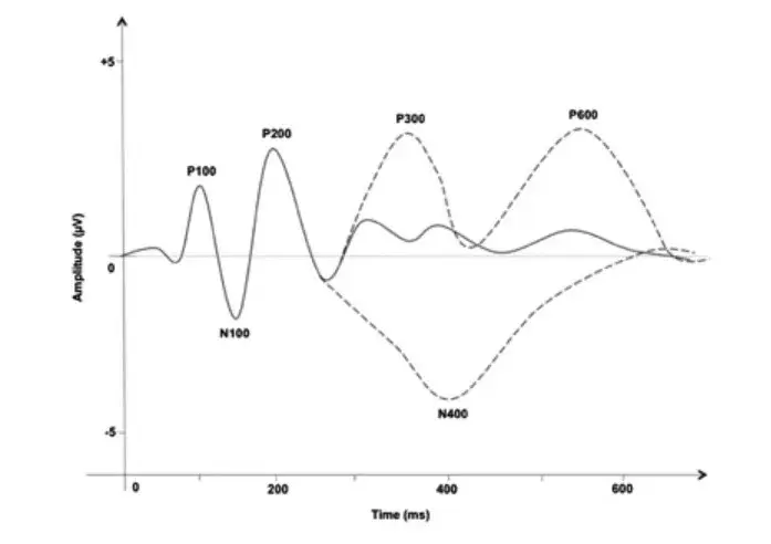 这些峰值被称为“成分”,并根据其极性标记:P代表正,N代表负,其后的数字表示延迟时间(以毫秒为单位)。例如,P100表示刺激开始后约100毫秒出现的正峰值。负向波与激活有关,正向波与抑制有关。