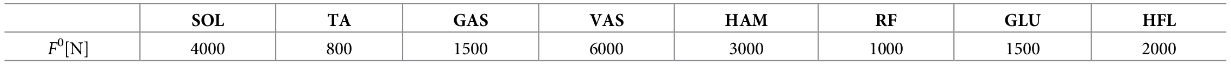 在肌肉执行器模型中,力-长度关系 Fl 和力-速度关系 Fv 分别表示肌肉在不同长度和速度下产生的力。被动力 Fp 是无论肌肉是否激活都存在的力。最大等长力 F0 则是每个肌肉执行器在最大激活时产生的力,其数值因不同肌肉而异(如表2所示)。这些数值与以往的研究一致。