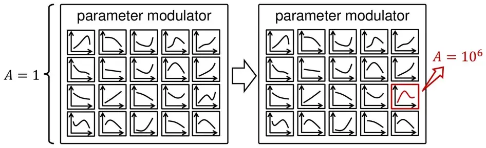 左:替换前,所有函数均以A = 1 导出。右:仅将目标控制参数函数(红色)替换为A = 106。
