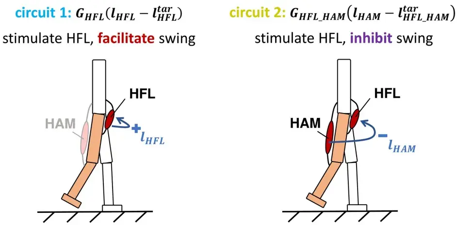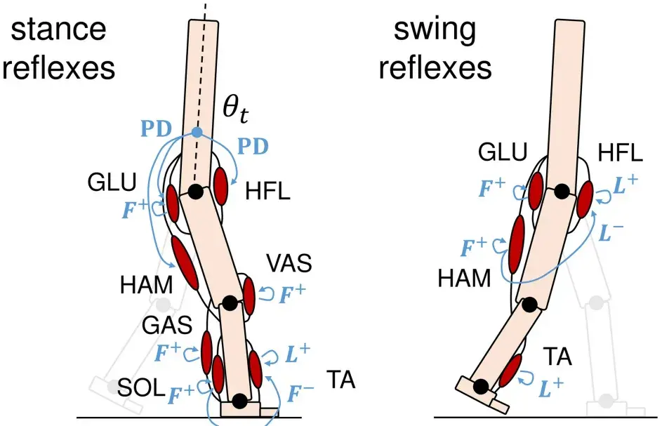 肌肉骨骼模型由激活的肌肉驱动,这些肌肉接收来自脊髓层中基于反射的控制器的刺激信号u。每条腿(右腿和左腿)由单独的站立和摆动反射控制。控制律根据腿是否接触地面而切换。来自模型的传感信息反馈给控制器以产生运动。脊髓上层控制步行速度并调整所需的脚部位置。