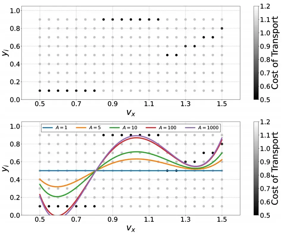 左图:具有不同A值的生成步态的估计 CoT 曲线。