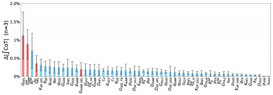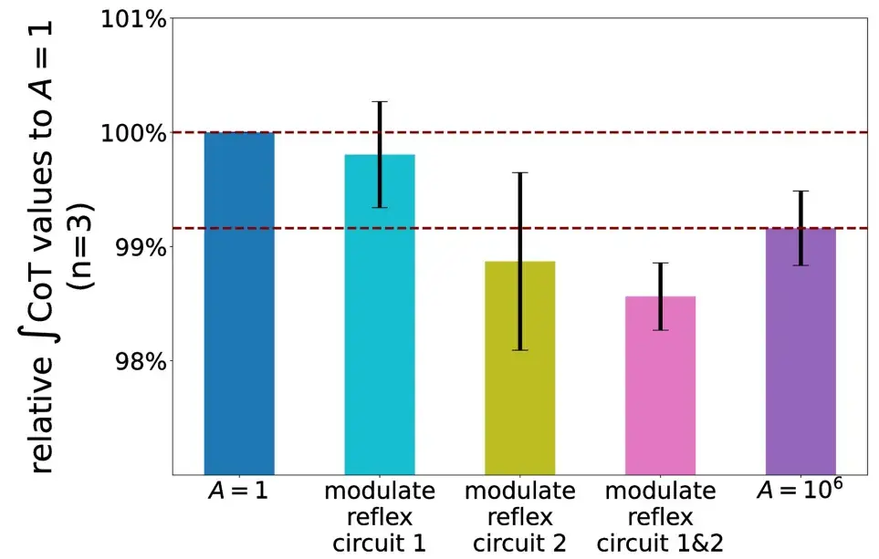 这张图展示了在调节反射电路 (n = 3) 时,相对于基准值 A = 1 的步行 ∫CoT 值的变化。图中用不同颜色条表示不同的优化条件和参数对步态的影响。具体来说: