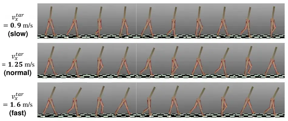 一个程序从目标速度 1.3 米/秒开始逐渐增加,另一个程序从 1.2 米/秒开始逐渐减少,初始控制参数相同。控制参数 Y 针对每个目标速度进行优化,生成步态。