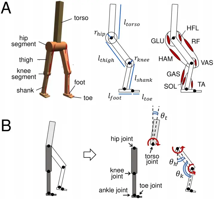 模型包含12个部分:躯干、髋部、两条大腿、两条膝盖、两条小腿、两只脚和两组脚趾,运动限制在矢状面内。每条腿有八个肌肉致动器,反映了臀大肌(GLU)、髋屈肌(HFL)、股四头肌(VAS)、胫前肌(TA)、比目鱼肌(SOL)、腘绳肌(HAM)、股直肌(RF)和腓肠肌(GAS)的肌肉活动。