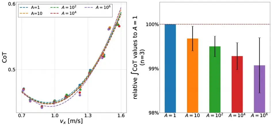 右图:具有不同A值的生成步态的相对 ∫CoT 值( n = 3)。
