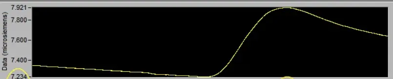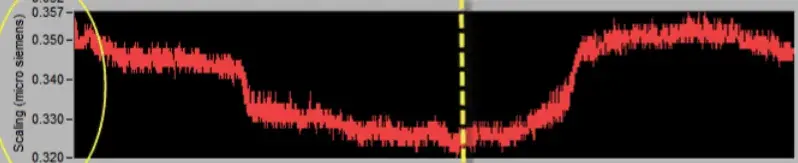 低振幅信号如上图所示,数值在0左右但有些许起伏。这跟个体生理有很大的关系,有些被试的皮电反应较不敏感,在正式实验前需要进行预测和呼吸测试,以排除该类被试。
