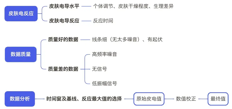 | 原发性皮肤反应(Galvanic Skin Response,GSR) | 皮肤电导或电阻的变化,是由交感神经系统引起的汗腺活动变化所致。 | GSR常用于指代皮肤电活动,特别是指由情绪或应激引起的皮肤电导变化。 | GSR和EDA在实际使用中常互换使用,但GSR更强调的是原发性(直接由情绪或应激引起的)皮肤电反应。 |