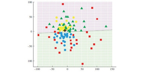 按此方式构建出出时间-空间注视模式图后,多数受控被试组都被分配到近中央区域的位置,而多数孤独症被试者则分布在周围区域(见右上图的模式图,图中中心位置的“+”代表中值,可理解为观看视频刺激材料时最常规的观看方式)。因此受控组到“中央区域”的距离(多维标度距离)要小于ASD被试组。研究结果显示出常规受控组的时间-空间注视模式是相似的,而孤独症被试组中,每名被试者之间显示出不规则的注视行为。