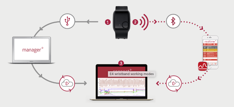 E4配备了采集高质量数据的传感器。它是结合了EDA(GSR)和PPG传感器的可穿戴设备,能够同时测量交感神经系统活动和心率。