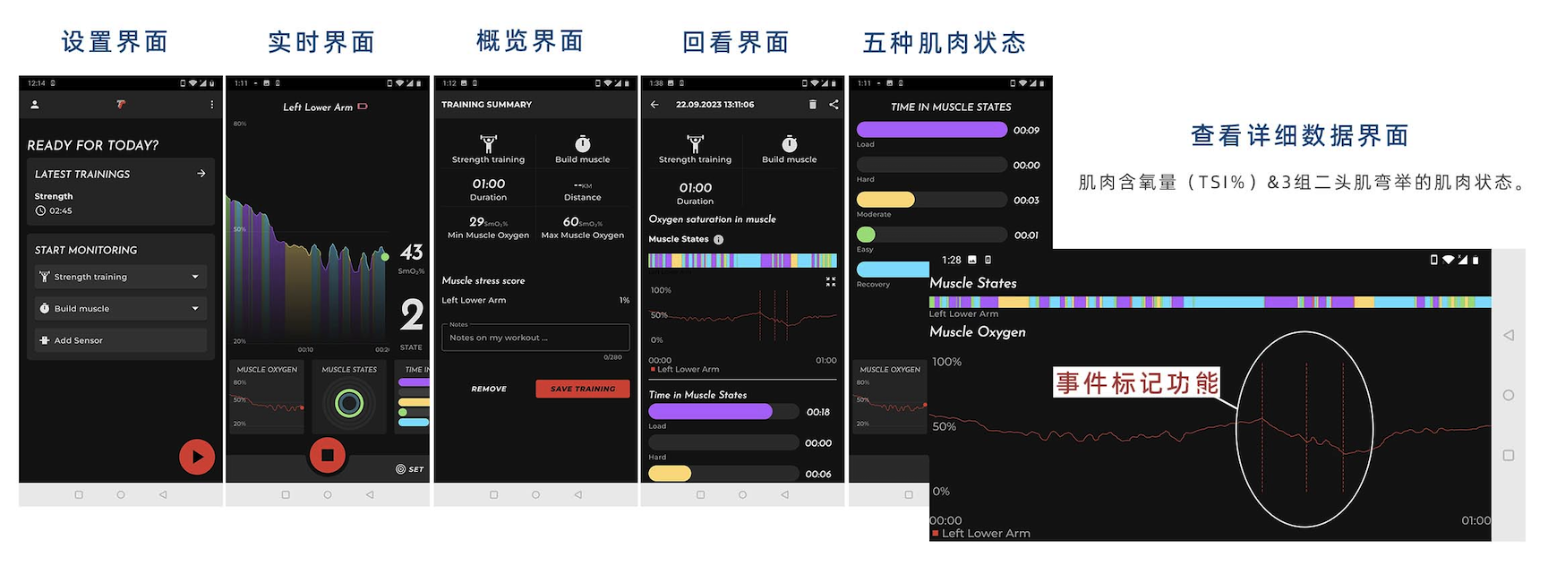 实时显示五种肌肉状态。在肌肉发力中达到红色状态,反之,保持在绿色状态。
